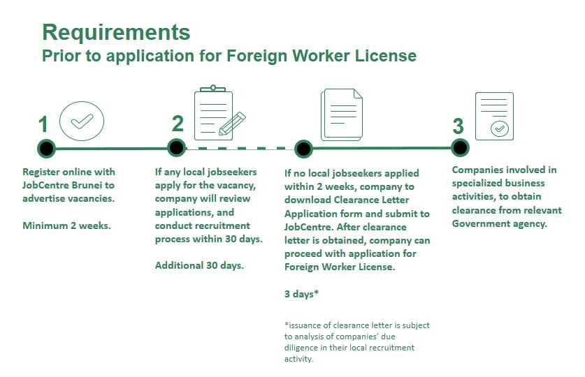 Prior to applying for Foreign Worker License (LPA), companies must advertise the vacancy in JobCentre Brunei to open opportunities to locals first for a minimum of 2 weeks.