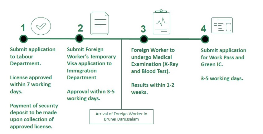 Once applicants have obtained their Visa and the Foreign Worker has arrived in Brunei Darussalam, they may proceed to the Ministry of Health to undergo the required medical examination, which typically takes one to two weeks.