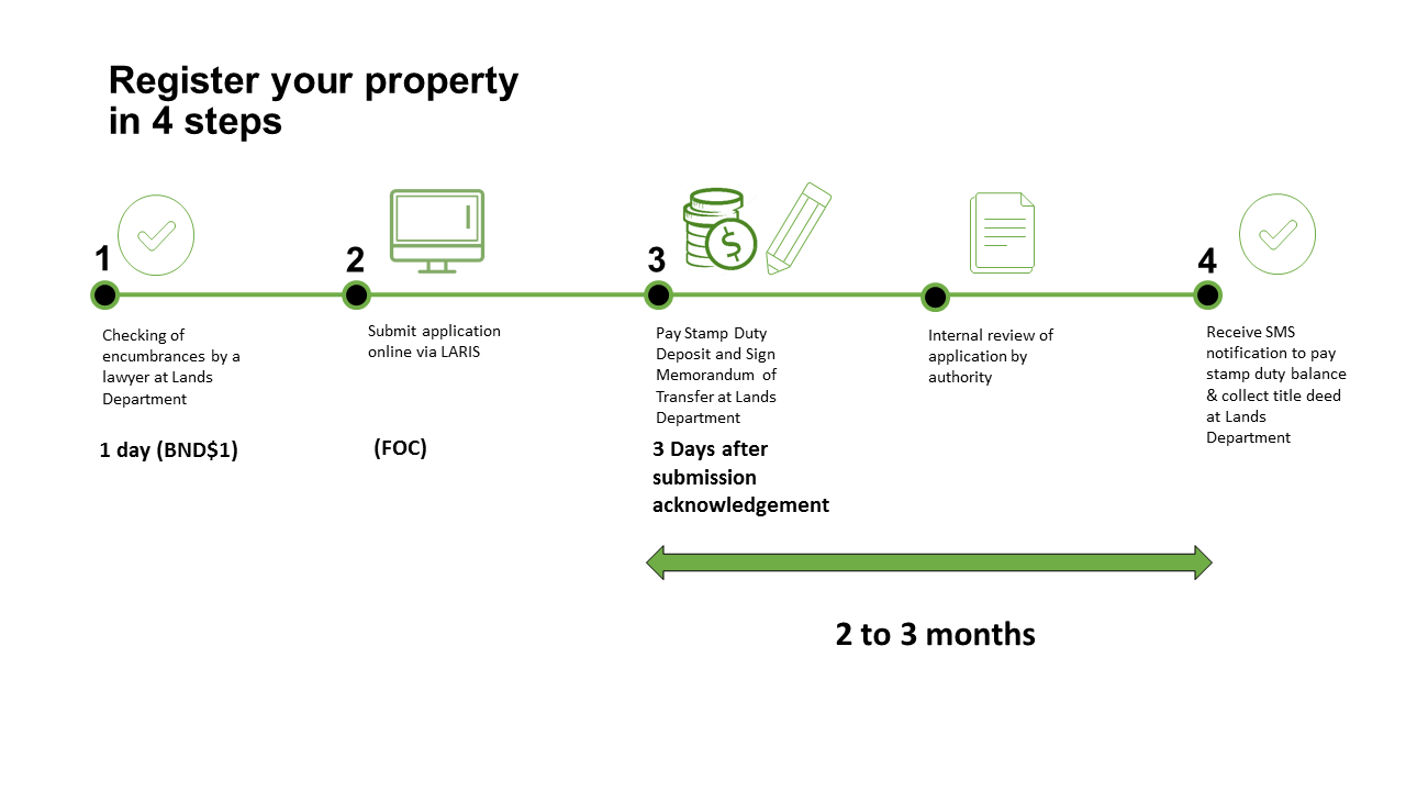 Upon Lands Department receiving approval from the Higher Authority, your lawyer will be immediately notified via SMS to settle the remaining balance of stamp duty (if any) and collect the Title Deed at the Lands Department.